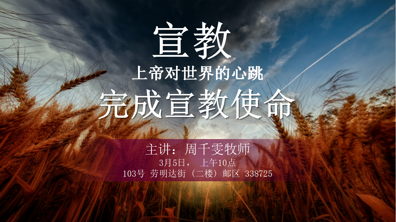 05mar10:00 am11:30 am华语崇拜 - 宣教 - 上帝对世界的心跳 - 完成宣教使命周千雯牧师10:00 am - 11:30 am 现场上午十点 在二楼 103 Lavender Street Singapore 338725