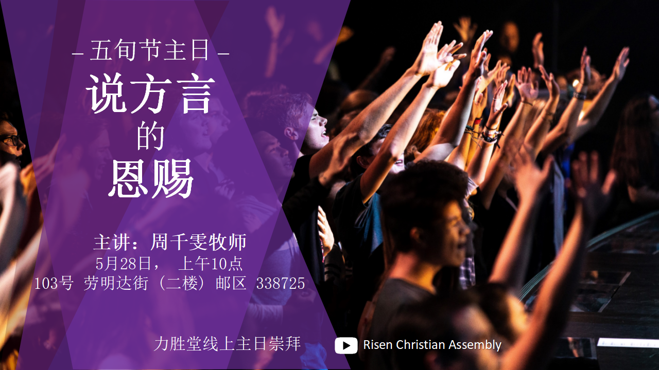 在五旬节那天,圣灵降在楼房里的120个人身上,永远地改变了他们的生活。 来临星期天, 周牧师将与我们探索如何从说方言的恩赐中得益。 现场上午十点 在 103号劳明达街, 二楼, 邮区338725