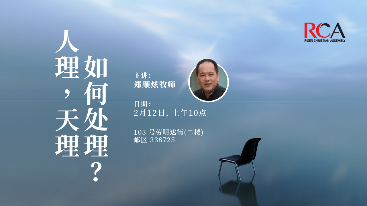 february, 2023 华语崇拜 - 人理,天理,如何处理? 12feb10:00 am11:30 am华语崇拜 - 人理,天理,如何处理?郑顺炫牧师10:00 am - 11:30 am 现场上午十点 在二楼 103 Lavender Street Singapore 338725 Event Details 人生如梦,梦如人生。盼望,愿望,希望有时领导我们来到绝望。怨天怨地,我们到底缺少了什么? 来临星期天,郑顺炫牧师将分享生命的真谛,让我们可以充实的生活。 现场上午十点 在 103号劳明达街, 二楼, 邮区338725 Event Details 人生如梦,梦如人生。盼望,愿望,希望有时领导我们来到绝望。怨天怨地,我们到底缺少了什么? 来临星期天,郑顺炫牧师将分享生命的真谛,让我们可以充实的生活。 现场上午十点 在 103号劳明达街, 二楼, 邮区338725 Time (Sunday) 10:00 am - 11:30 am Location现场上午十点 在二楼 103 Lavender Street Singapore 338725 CalendarGoogleCal