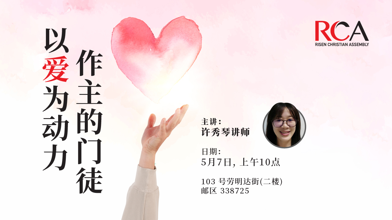 may, 2023 华语崇拜 - 以爱为动力,作主的门徒 07may10:00 am11:30 am华语崇拜 - 以爱为动力,作主的门徒许秀琴讲师10:00 am - 11:30 am 现场上午十点 在二楼 103 Lavender Street Singapore 338725 Event Details 基督徒的生活是由对基督的爱所引导的,并通过顺服基督的跟随来表现的。 来临星期天,许秀琴讲师将分享以爱为动力,作主的门徒。 现场上午十点 在 103号劳明达街, 二楼, 邮区338725 Event Details 基督徒的生活是由对基督的爱所引导的,并通过顺服基督的跟随来表现的。 来临星期天,许秀琴讲师将分享以爱为动力,作主的门徒。 现场上午十点 在 103号劳明达街, 二楼, 邮区338725 Time (Sunday) 10:00 am - 11:30 am Location现场上午十点 在二楼 103 Lavender Street Singapore 338725 CalendarGoogleCal
