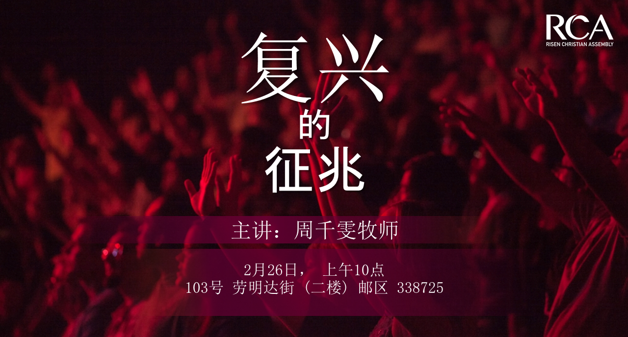 february, 2023 华语崇拜 - 复兴的征兆 26feb10:00 am11:30 am华语崇拜 - 复兴的征兆周千雯牧师10:00 am - 11:30 am 现场上午十点 在二楼 103 Lavender Street Singapore 338725 Event Details 我们祈祷、追求、渴望复兴,但是复兴是什么呢? 来临星期天,周千雯牧师将研读经文,向我们展示复活的神迹。 现场上午十点 在 103号劳明达街, 二楼, 邮区338725 Event Details 我们祈祷、追求、渴望复兴,但是复兴是什么呢? 来临星期天,周千雯牧师将研读经文,向我们展示复活的神迹。 现场上午十点 在 103号劳明达街, 二楼, 邮区338725 Time (Sunday) 10:00 am - 11:30 am Location现场上午十点 在二楼 103 Lavender Street Singapore 338725 CalendarGoogleCal