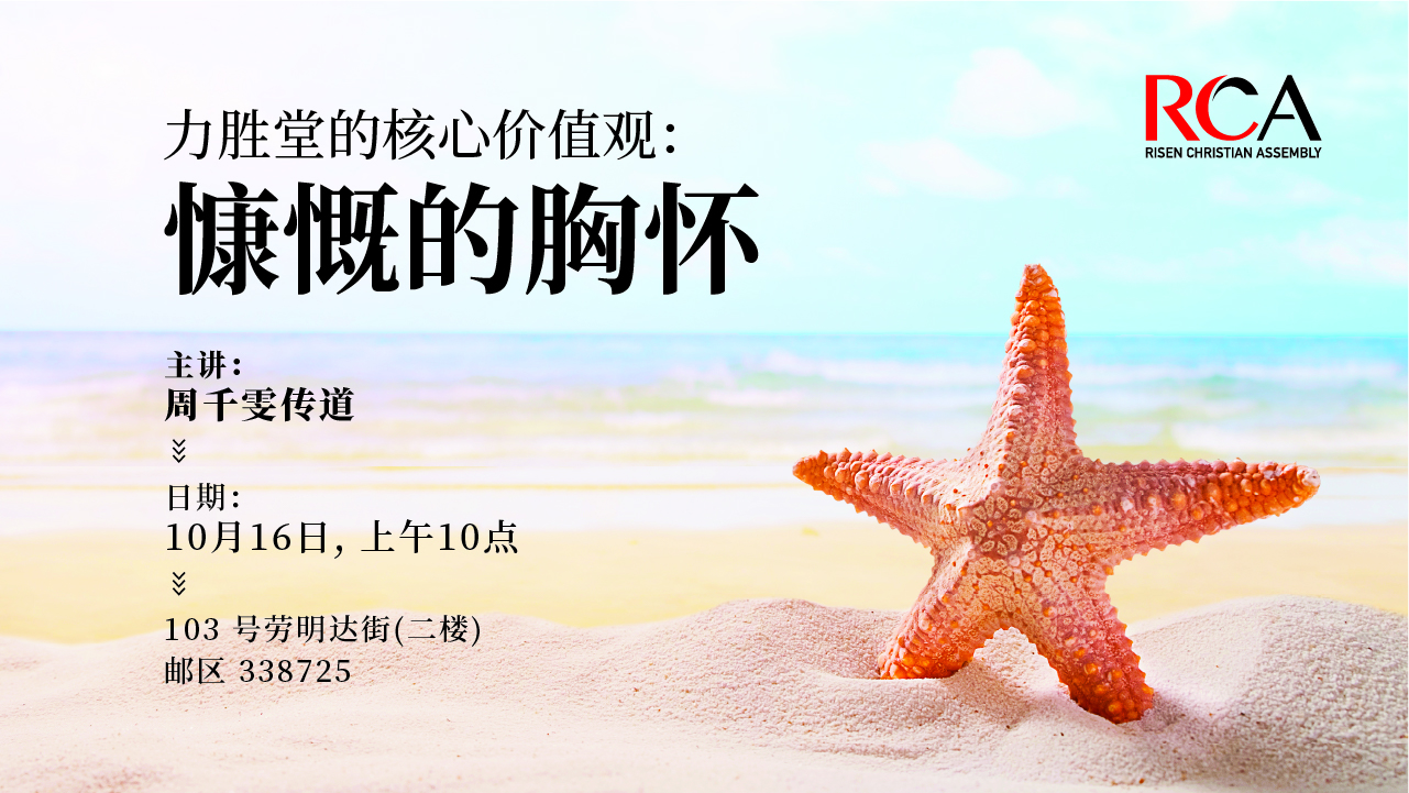 神是我们祝福的源头,祂毫无保留地把最好的祝福赐予我们。我们要效法神的慷慨,成为祝福他人的管道,让他们也蒙神的祝福。 来临星期天,周千雯传道将分享神慷慨的定义,让我们实践这价值观。 现场上午十点 在二楼 103 Lavender Street Singapore 338725