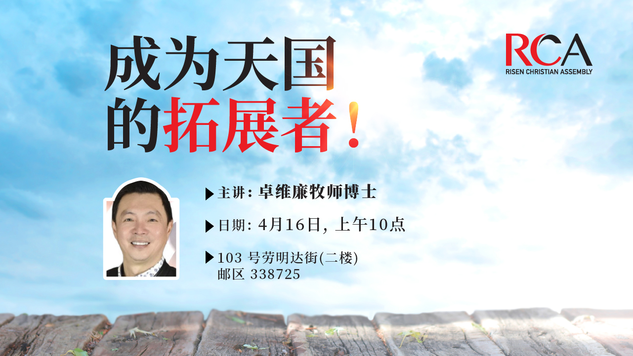 耶稣基督呼召每个基督徒成为他天国的拓展者,拯救万民成为神的子民。天国的拓展不仅是指信主的人数增加,它也包括传福音地界的扩展。 来临星期天,卓维廉牧师博士将分享如何成为天国的拓展者,一起参与天国的计划。 现场上午十点 在 103号劳明达街, 二楼, 邮区338725