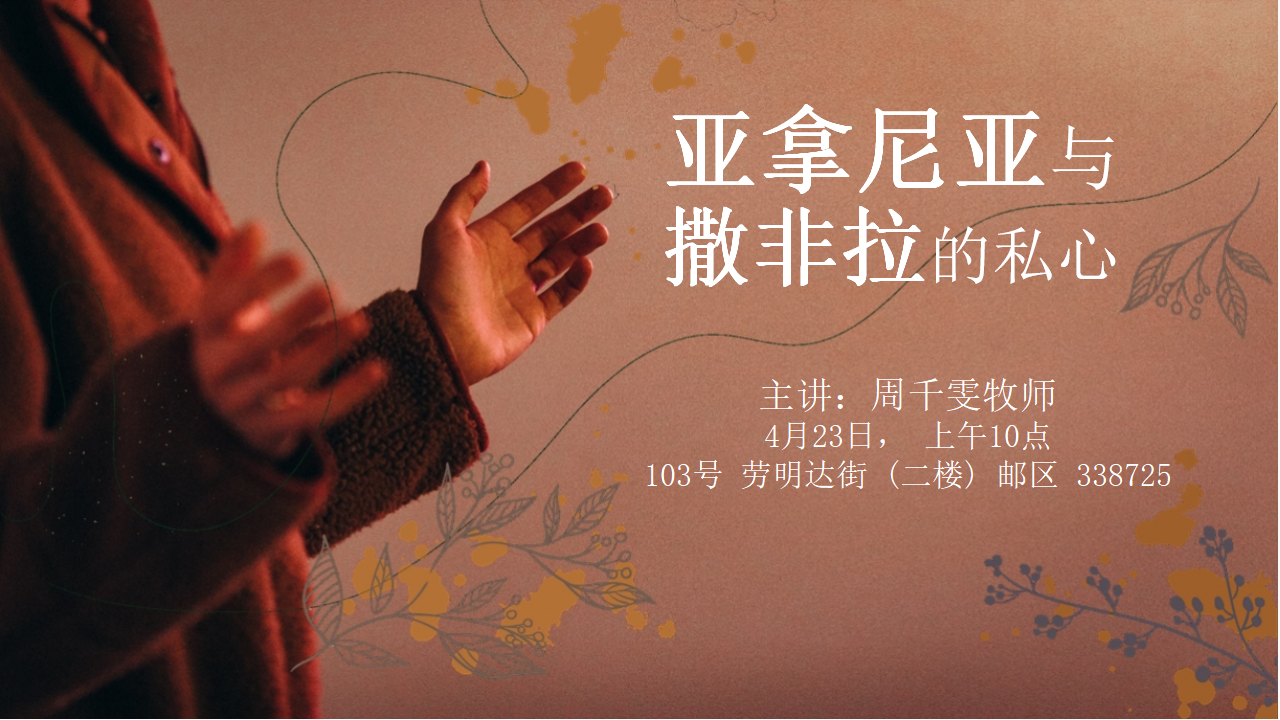 april, 2023 华语崇拜 - 亚拿尼亚与撒非拉的私心 23apr10:00 am11:30 am华语崇拜 - 亚拿尼亚与撒非拉的私心周千雯牧师10:00 am - 11:30 am 现场上午十点 在二楼 103 Lavender Street Singapore 338725 Event Details 上帝要我们的生命完全奉献予祂,不可有任何私心。 来临星期天,周千雯牧师将与我们分享亚拿尼亚和撒非拉私心的后果,让我们的心有所警惕。 现场上午十点 在 103号劳明达街, 二楼, 邮区338725 Event Details 上帝要我们的生命完全奉献予祂,不可有任何私心。 来临星期天,周千雯牧师将与我们分享亚拿尼亚和撒非拉私心的后果,让我们的心有所警惕。 现场上午十点 在 103号劳明达街, 二楼, 邮区338725 Time (Sunday) 10:00 am - 11:30 am Location现场上午十点 在二楼 103 Lavender Street Singapore 338725 CalendarGoogleCal