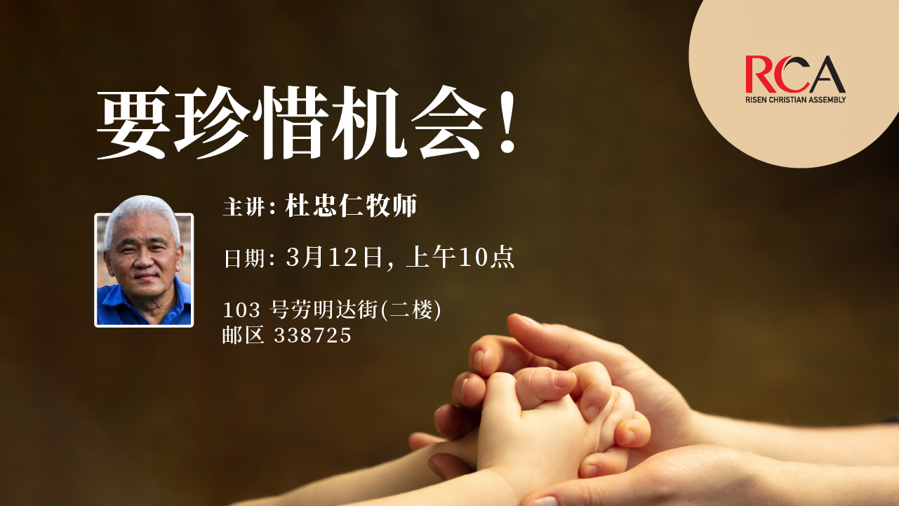 12mar10:00 am11:30 am华语崇拜 - 要珍惜机会!杜忠仁牧师10:00 am - 11:30 am 现场上午十点 在二楼 103 Lavender Street Singapore 338725