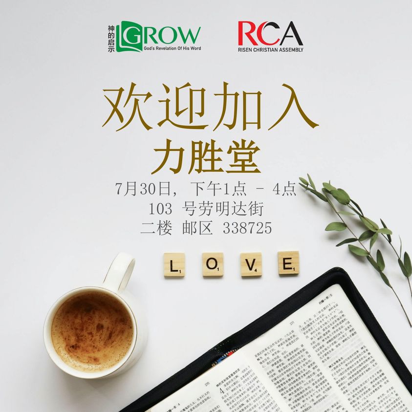 欢迎加入力胜堂的成长课程是收洗礼和成为教会会员的先决条件。 这课程讲述的课题包括谁是神?耶稣做了什么?圣灵的工作和教会的条例。这课程也包括力胜堂的异象,核心价值观与文化。 请向小组组长或周千雯牧师登记报名参加这成长课程。 现场上午十点 在二楼 103 Lavender Street Singapore