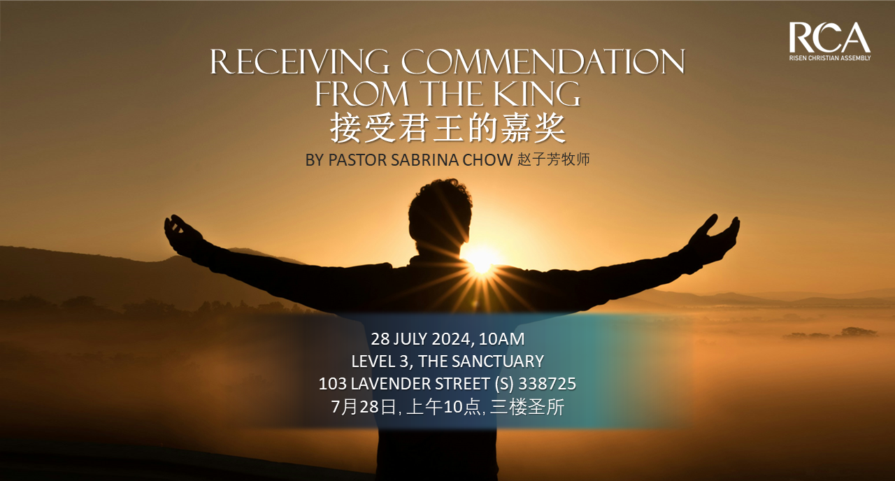 28jul10:00 am12:00 pmSunday Service -Receiving Commendation from the King. 华语崇拜: 接受君王的嘉奖Pastor Sabrina Chow 赵子芳牧师10:00 am - 12:00 pm Risen Christian Assembly, The Sanctuary, Level 3 三楼,圣所。