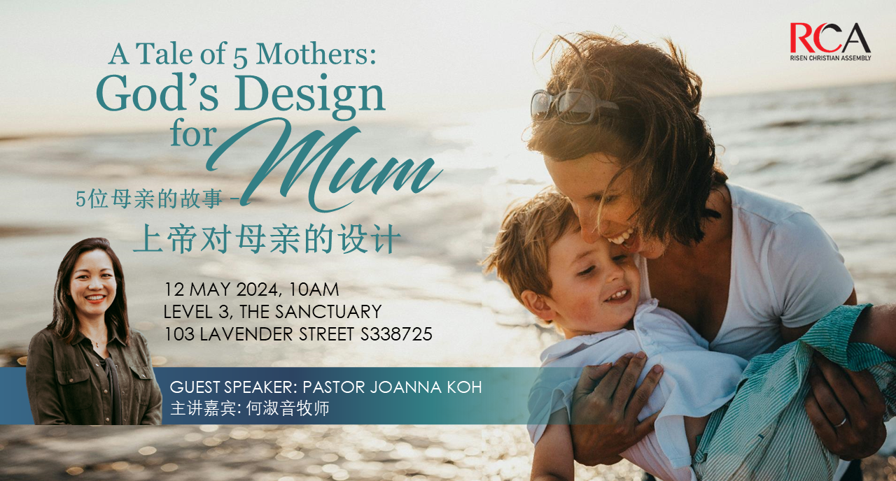12may10:00 am12:00 pmMother's Day Service - A TALE OF 5 MOTHERS: God’s Design for Mum 母亲节华语崇拜 - 五位母亲节的故事: 上帝对母亲的设计Pastor Joanna Koh-Hoe 何淑音牧师10:00 am - 12:00 pm Risen Christian Assembly, The Sanctuary, Level 3 三楼,圣所。