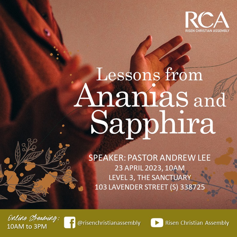 23apr10:00 am11:30 amSunday Service -Lessons From Ananias and SapphiraSpeaker: Pastor Andrew Lee10:00 am - 11:30 am Onsite@Level 3, 103 Lavender Street; Online on Facebook Live (English) & YouTube Live (English)
