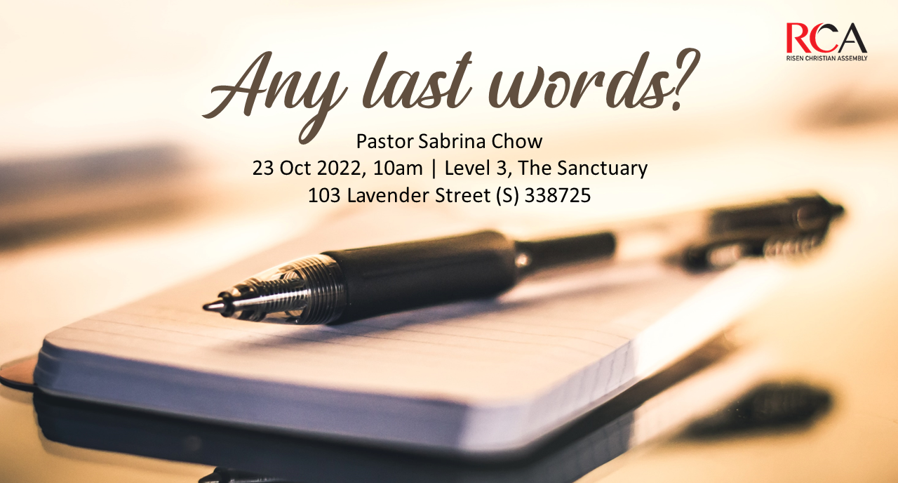 If there are hours left to live, what would be your last words? What would be the most important thing to you if life is ebbing away? Join Pastor Sabrina Chow as she expounds on the last words of Jesus and what was important to him.