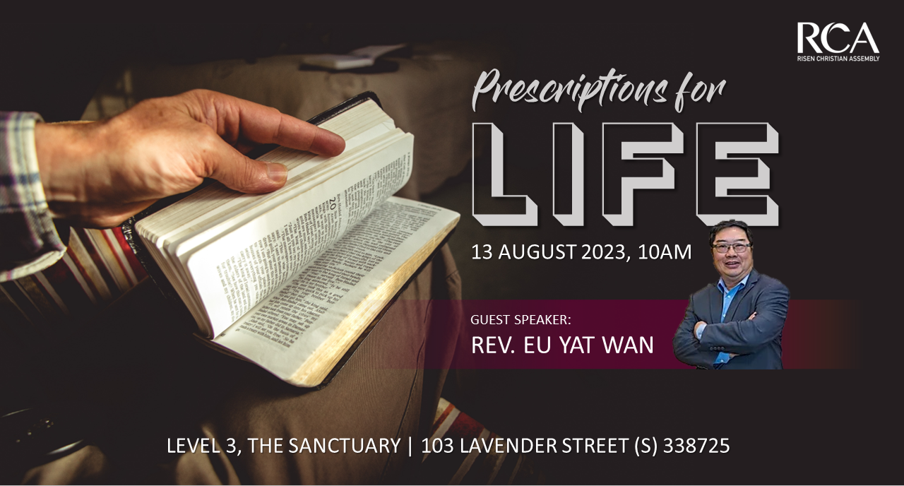 13aug10:00 am11:30 amSunday Service - Prescriptions for LifeSpeaker: Rev Eu Yat Wan10:00 am - 11:30 am Onsite@Level 3, 103 Lavender Street; Online on Facebook Live (English) & YouTube Live (English)